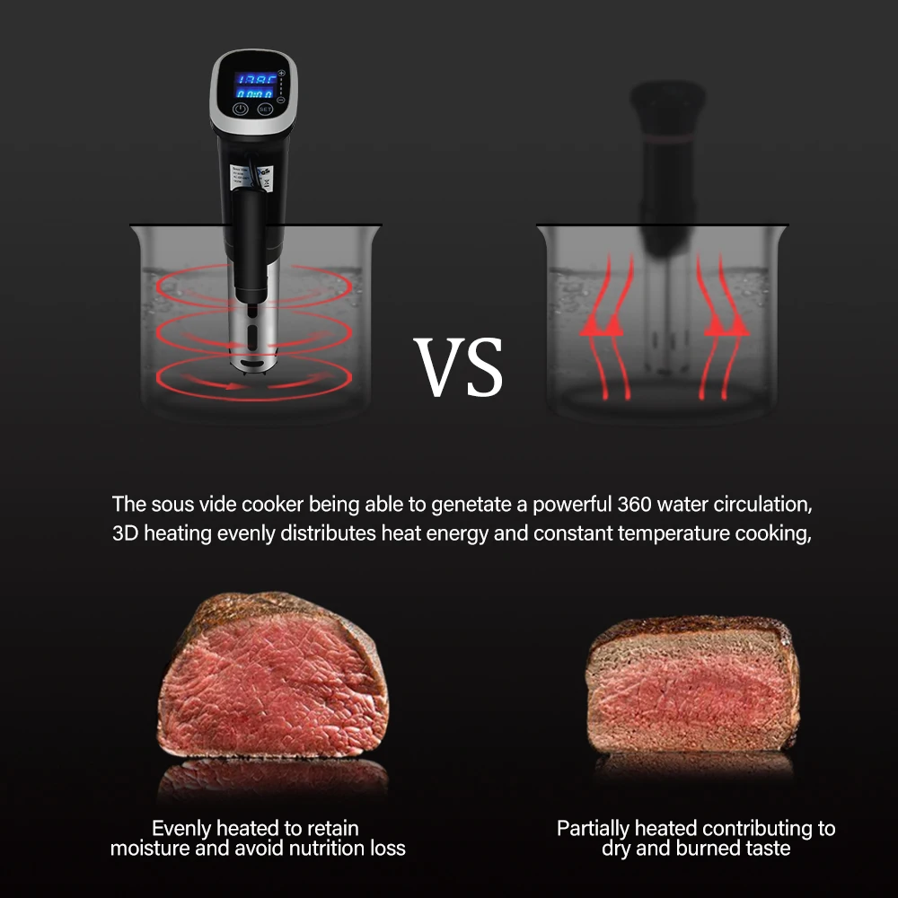 【Quiet with 3D Circulators Heating】Includes DC pump system, compare to standard AC motor, it is expensive but extremely quietly and durability. The pump circulates water at the exact temperature required for perfectly cooked, 360º water circulations keeps water temperature uniformly, no hot or cool spots.